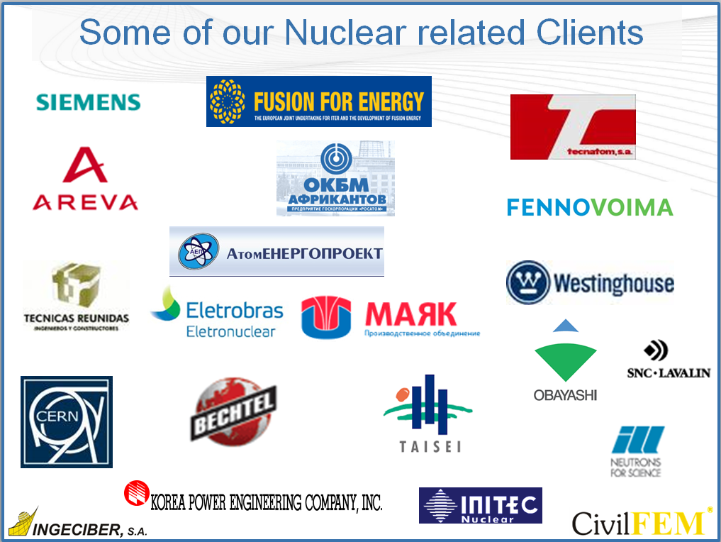 The great experience of CivilFEM for ANSYS is supported by having such outstanding NPP users; AREVA, BECHTEL, ATOMPROEK, WESTINGHOUSE, KOREA POWER ENERGY COMPANY, CERN, SIEMENS, FUSION FOR ENERGY, CHINA NORTHWEST ELECTRIC POWER DESIGN INSTITUTE, TAISEI, OBAYASHI…and so on.